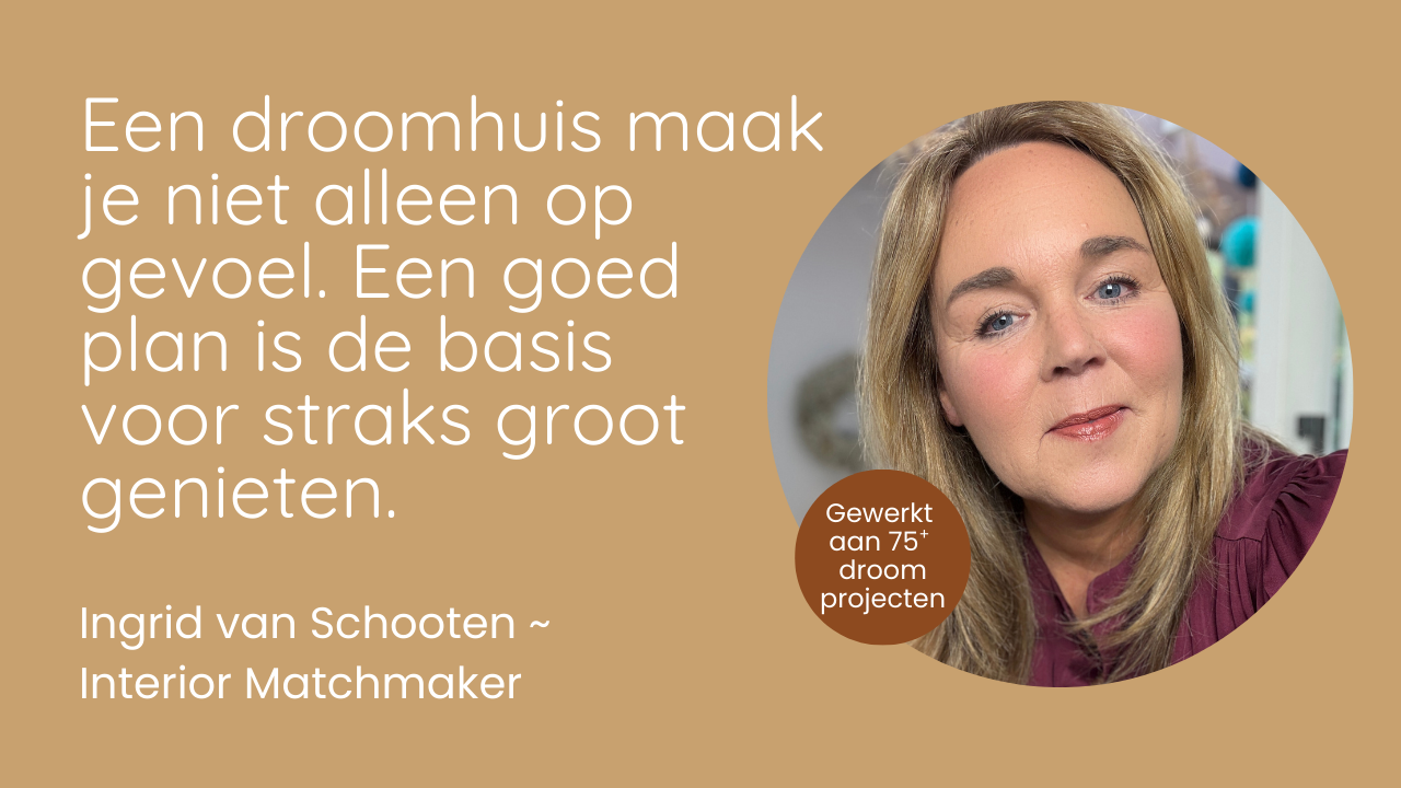 Je wilt straks thuiskomen in jouw droomhuis. Een huis dat klopt met wie jij bent, tot in de details. Je bent hier op de goede plek. Ik kan je helpen.